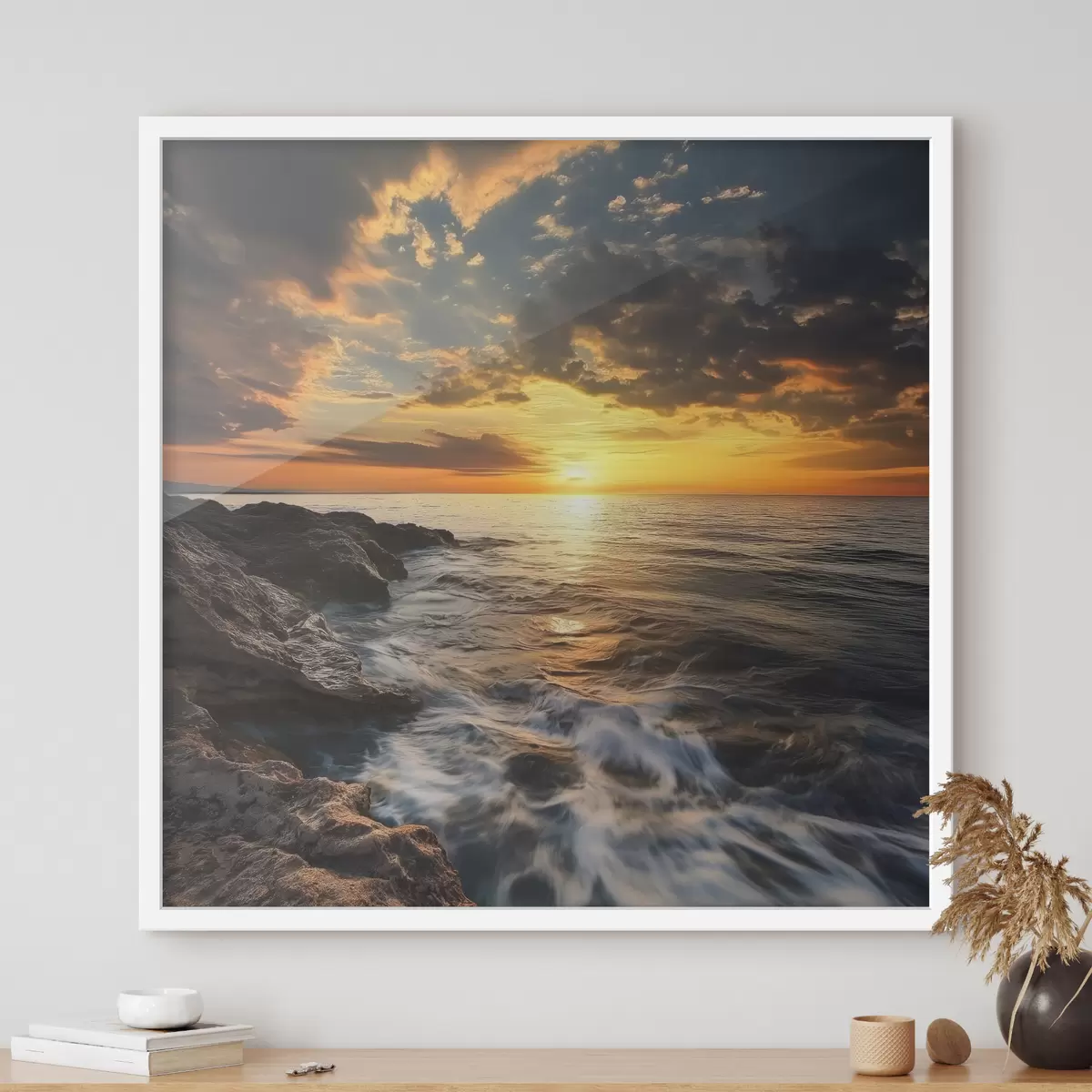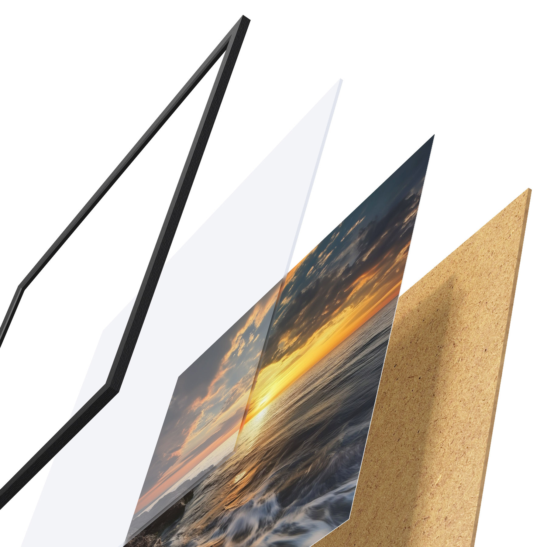 El póster consta de marco, plexiglás, imagen impresa y soporte de aglomerado. El póster puede colgarse inmediatamente en la pared gracias a los soportes de la parte posterior.