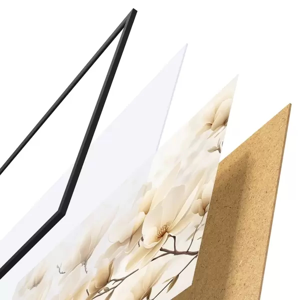 El póster consta de marco, plexiglás, imagen impresa y soporte de aglomerado. El póster puede colgarse inmediatamente en la pared gracias a los soportes de la parte posterior.