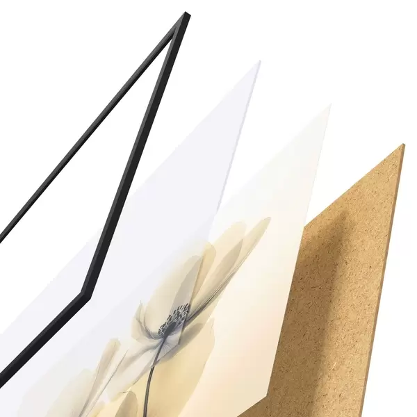 El póster consta de marco, plexiglás, imagen impresa y soporte de aglomerado. El póster puede colgarse inmediatamente en la pared gracias a los soportes de la parte posterior.