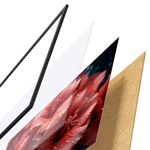 El póster consta de marco, plexiglás, imagen impresa y soporte de aglomerado. El póster puede colgarse inmediatamente en la pared gracias a los soportes de la parte posterior.