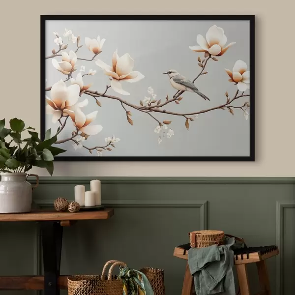 Poster Pájaro en una rama con magnolias en suaves colores pastel Nr f43320
