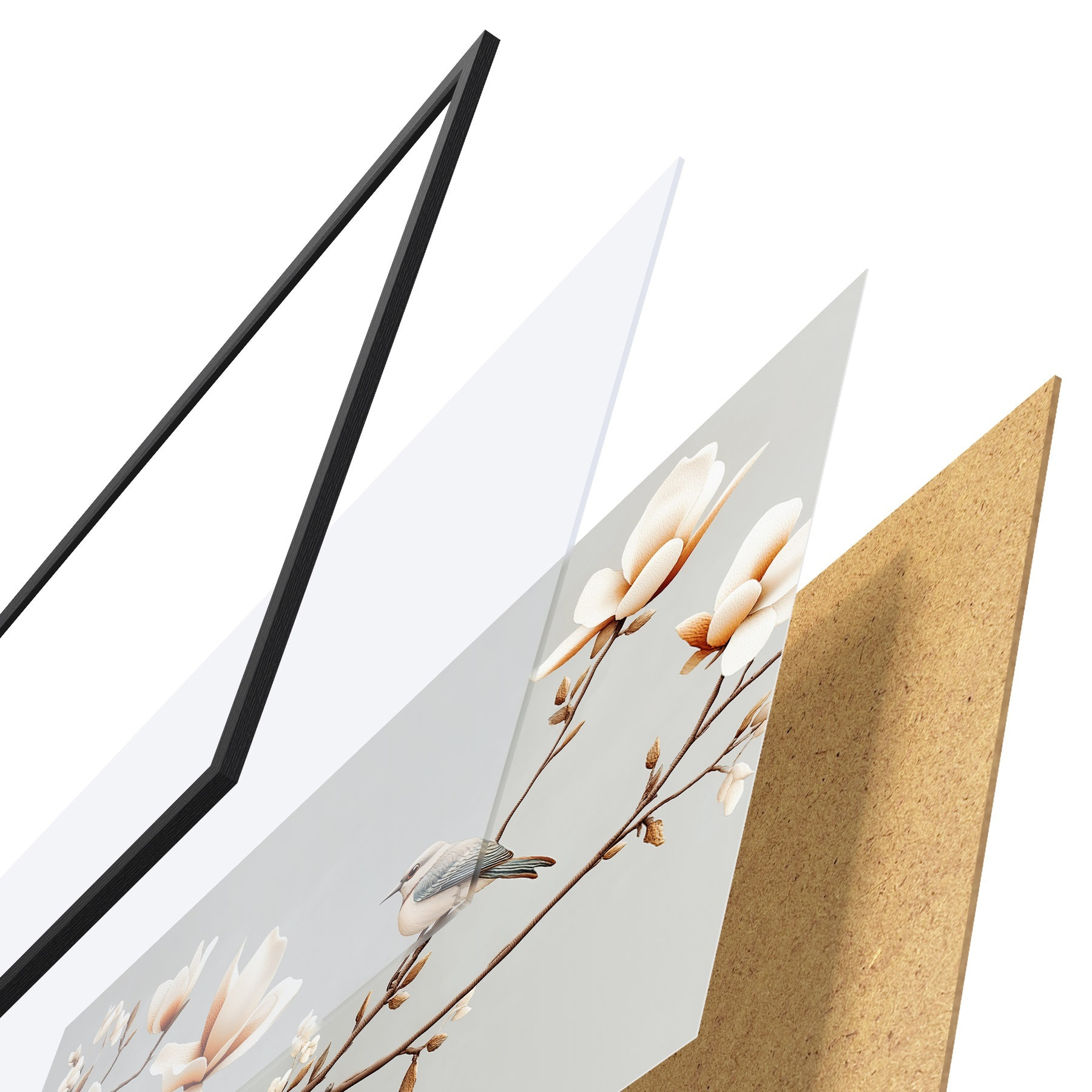El póster consta de marco, plexiglás, imagen impresa y soporte de aglomerado. El póster puede colgarse inmediatamente en la pared gracias a los soportes de la parte posterior.