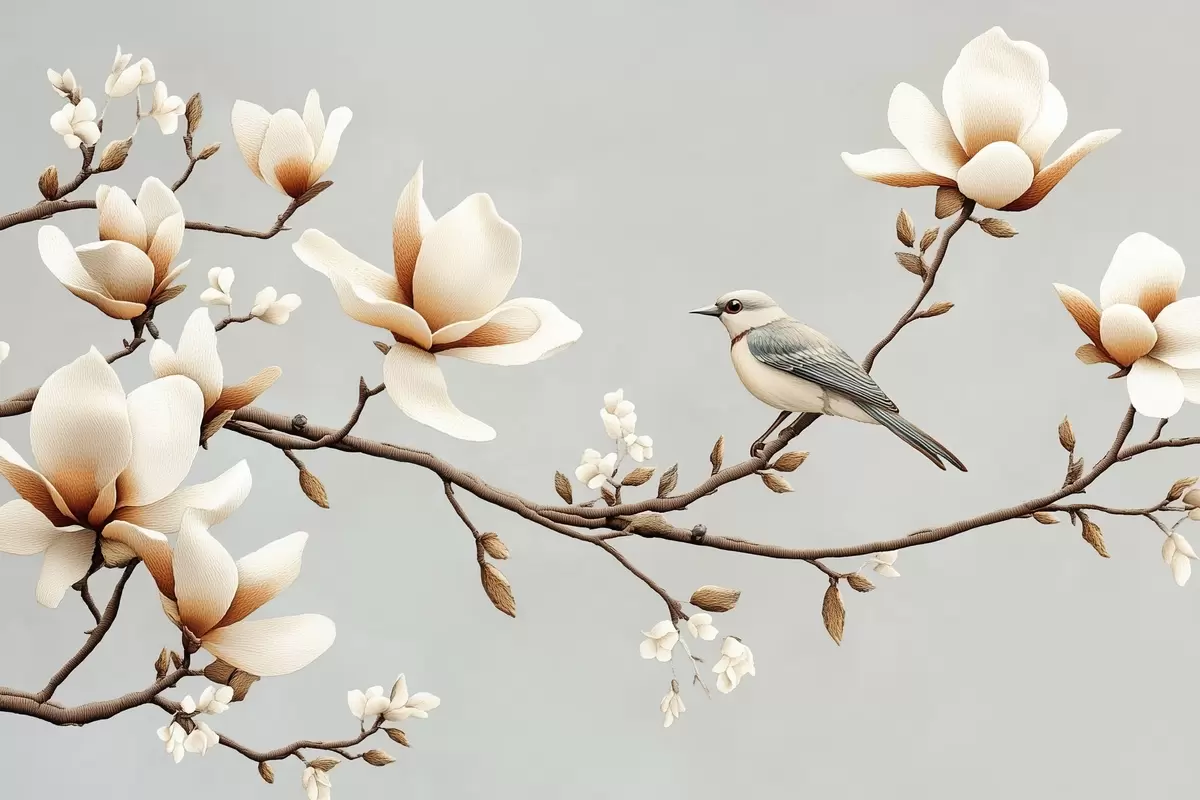 Poster Pájaro en una rama con magnolias en suaves colores pastel f43320