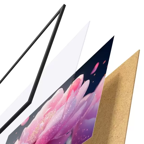 El póster consta de marco, plexiglás, imagen impresa y soporte de aglomerado. El póster puede colgarse inmediatamente en la pared gracias a los soportes de la parte posterior.