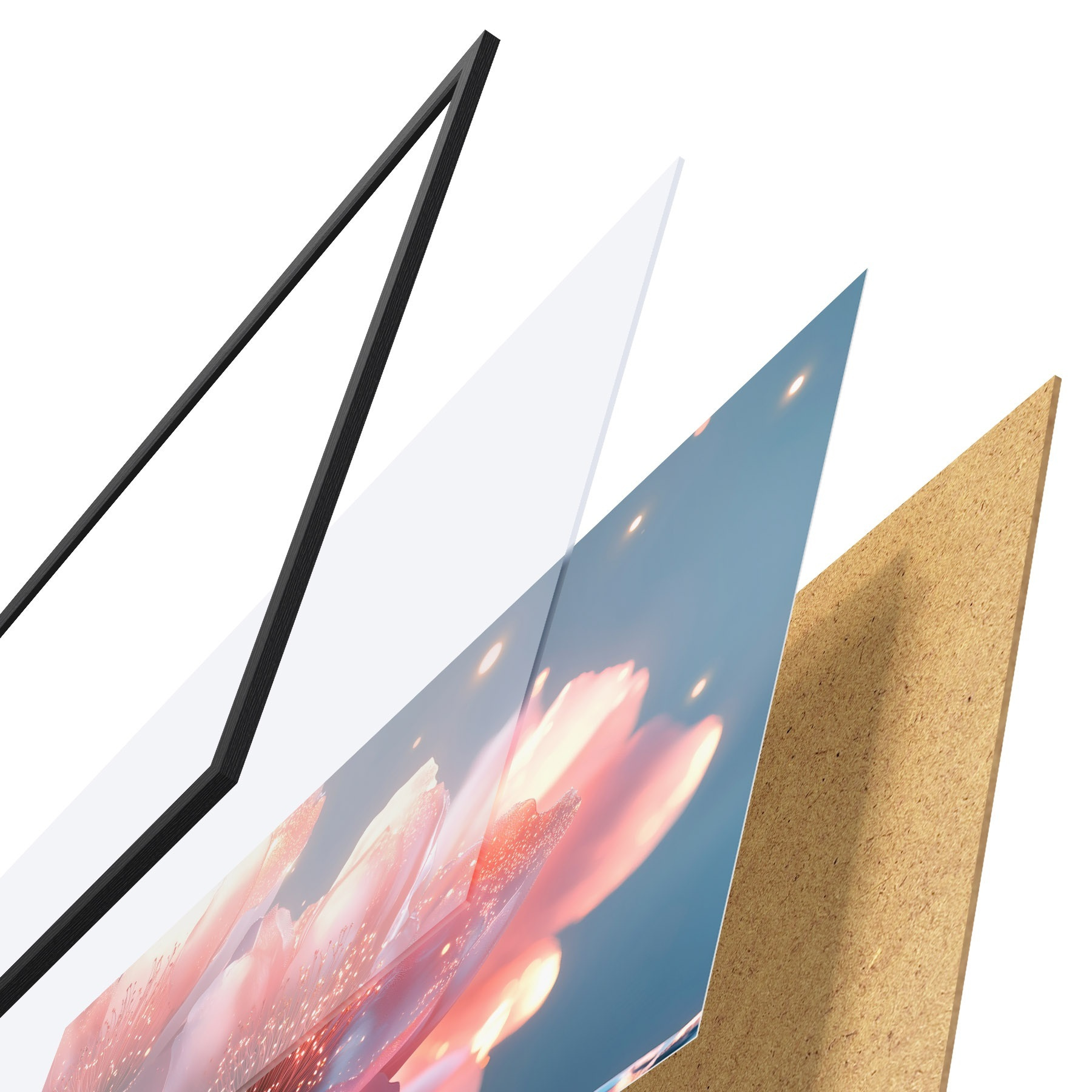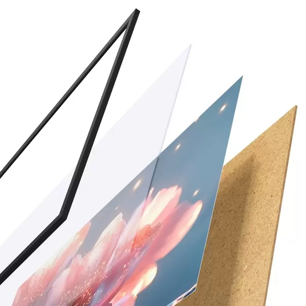 El póster consta de marco, plexiglás, imagen impresa y soporte de aglomerado. El póster puede colgarse inmediatamente en la pared gracias a los soportes de la parte posterior.