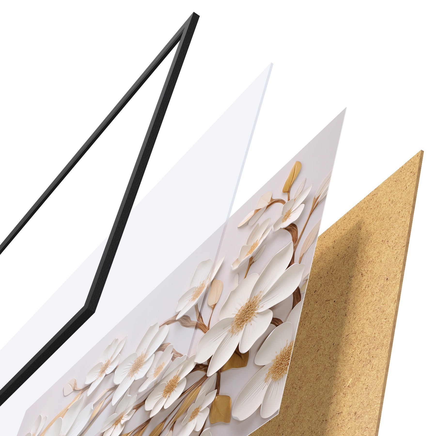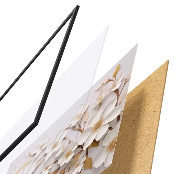 El póster consta de marco, plexiglás, imagen impresa y soporte de aglomerado. El póster puede colgarse inmediatamente en la pared gracias a los soportes de la parte posterior.
