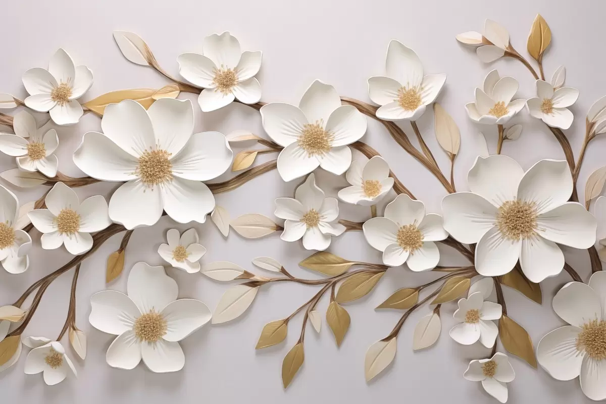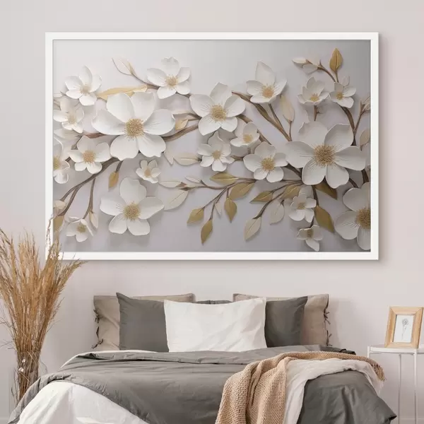 Poster Flores blancas al estilo de un fresco en relieve con toques amarillos f43331