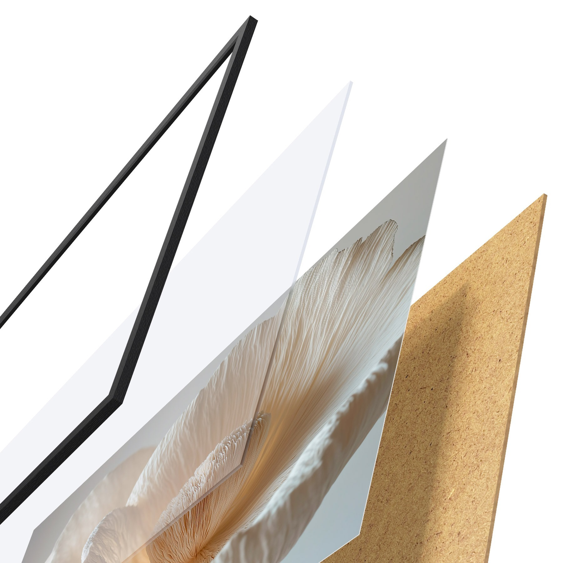 El póster consta de marco, plexiglás, imagen impresa y soporte de aglomerado. El póster puede colgarse inmediatamente en la pared gracias a los soportes de la parte posterior.