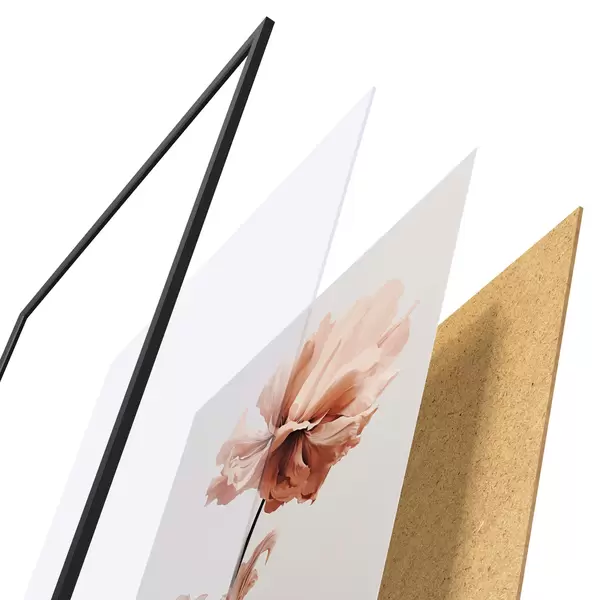 El póster consta de marco, plexiglás, imagen impresa y soporte de aglomerado. El póster puede colgarse inmediatamente en la pared gracias a los soportes de la parte posterior.
