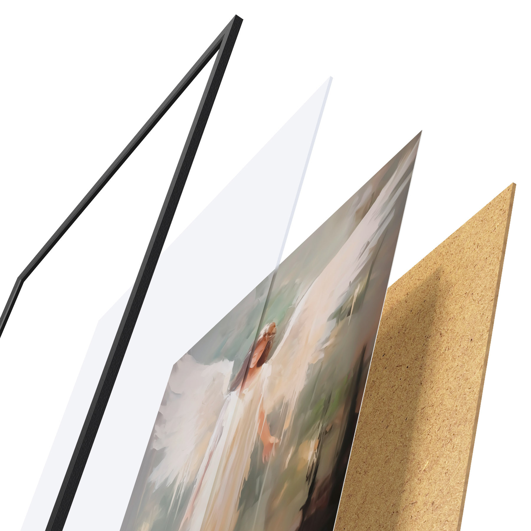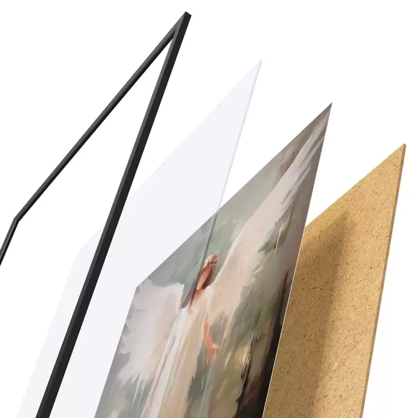 El póster consta de marco, plexiglás, imagen impresa y soporte de aglomerado. El póster puede colgarse inmediatamente en la pared gracias a los soportes de la parte posterior.