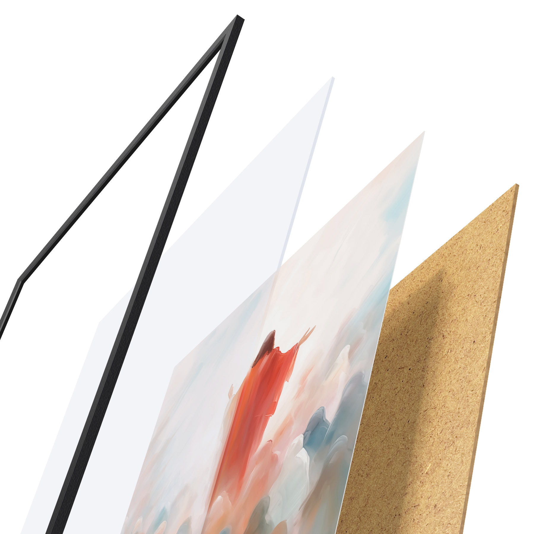 El póster consta de marco, plexiglás, imagen impresa y soporte de aglomerado. El póster puede colgarse inmediatamente en la pared gracias a los soportes de la parte posterior.