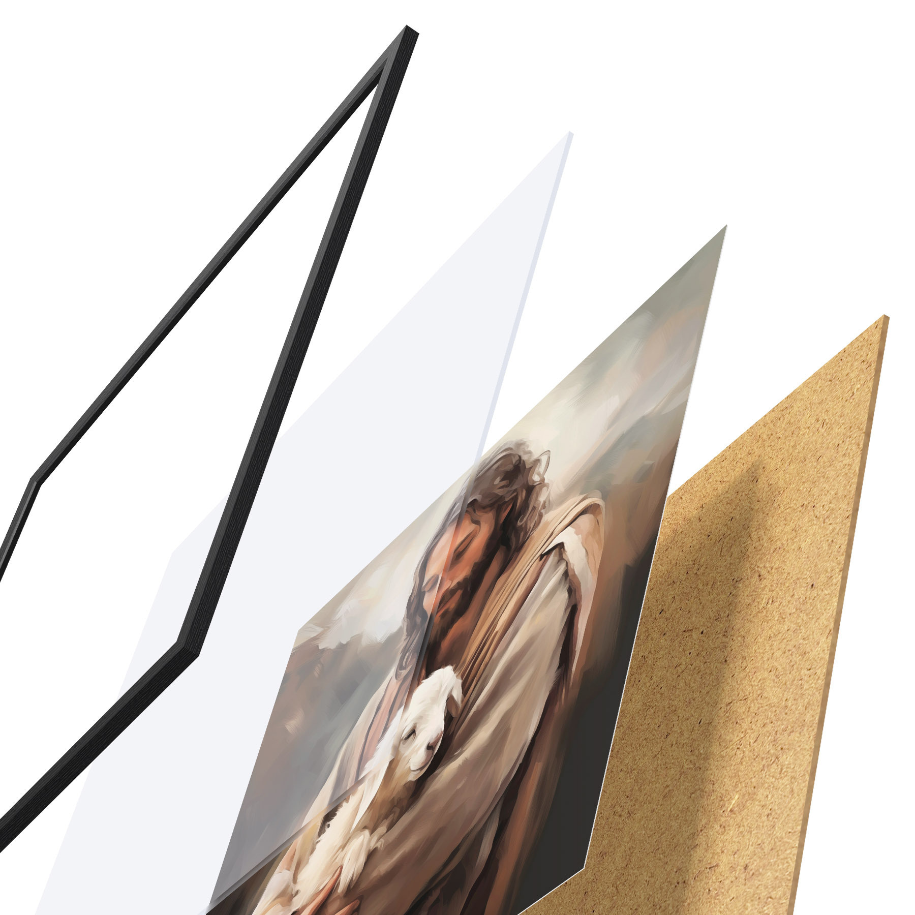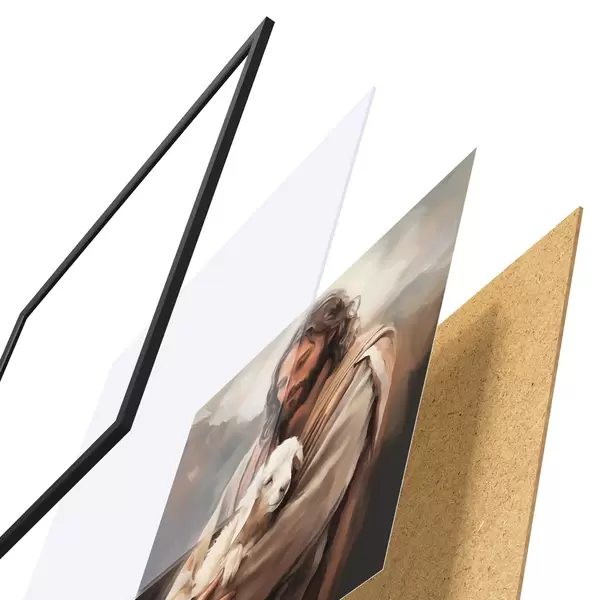 El póster consta de marco, plexiglás, imagen impresa y soporte de aglomerado. El póster puede colgarse inmediatamente en la pared gracias a los soportes de la parte posterior.