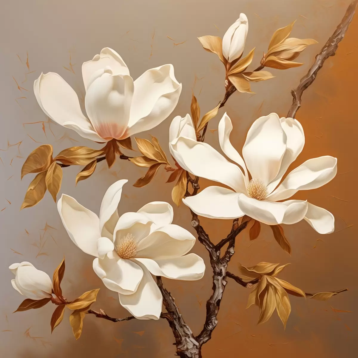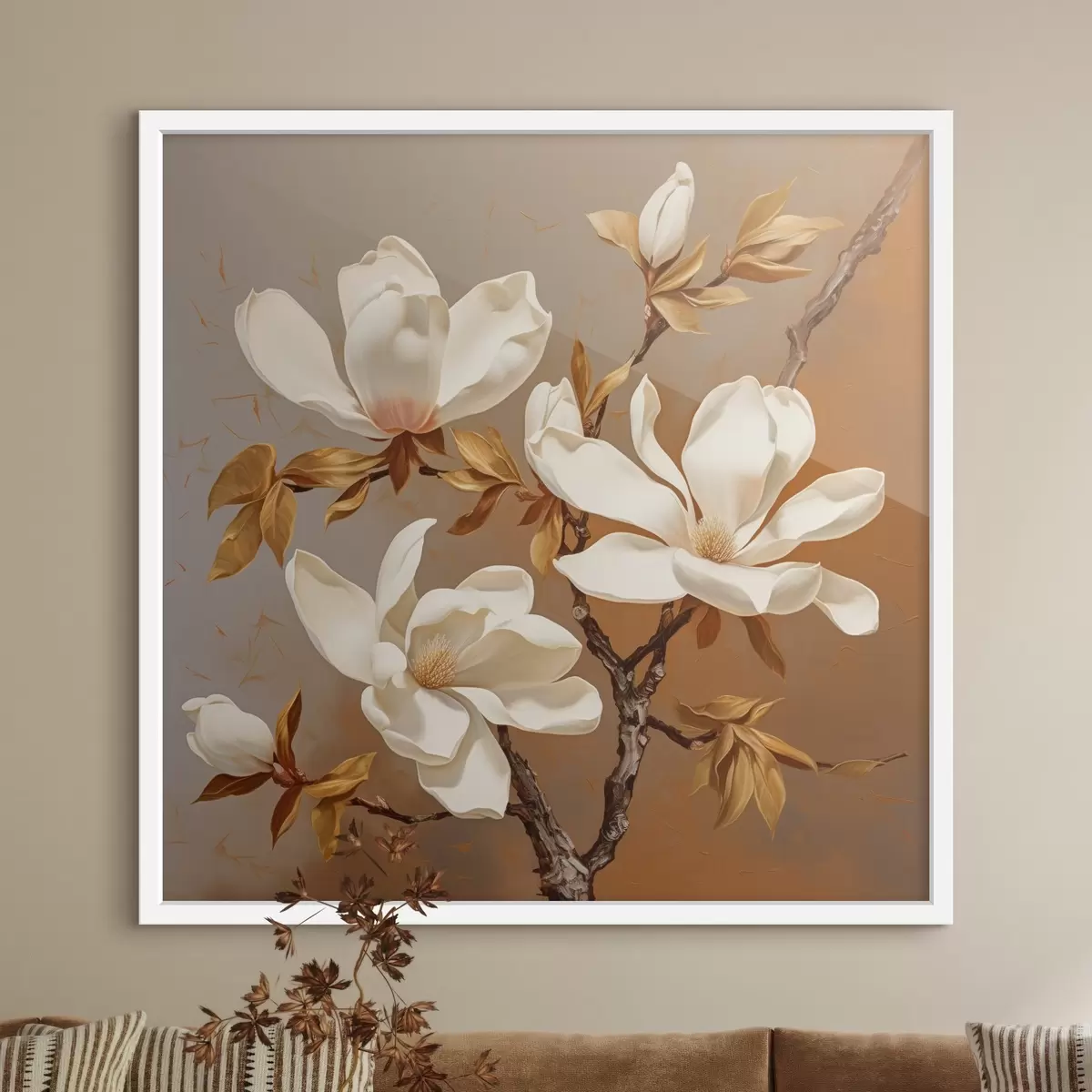 Poster Pintura al óleo con una magnolia blanca en una rama sobre fondo amarillo f43361