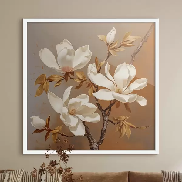 Poster Pintura al óleo con una magnolia blanca en una rama sobre fondo amarillo Nr f43361
