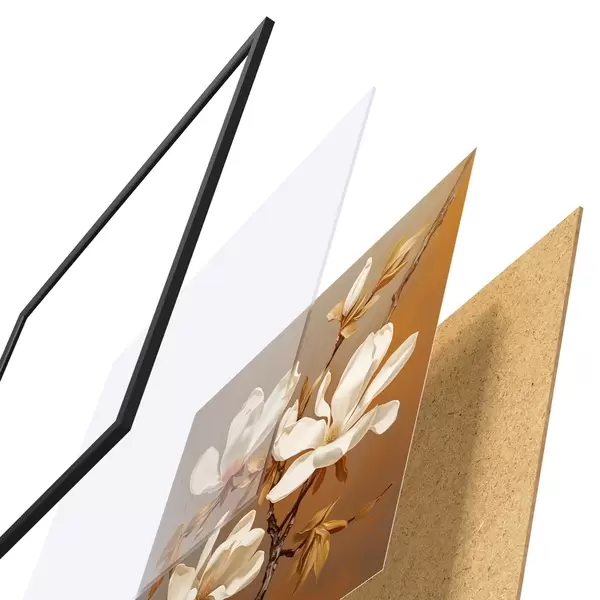 El póster consta de marco, plexiglás, imagen impresa y soporte de aglomerado. El póster puede colgarse inmediatamente en la pared gracias a los soportes de la parte posterior.