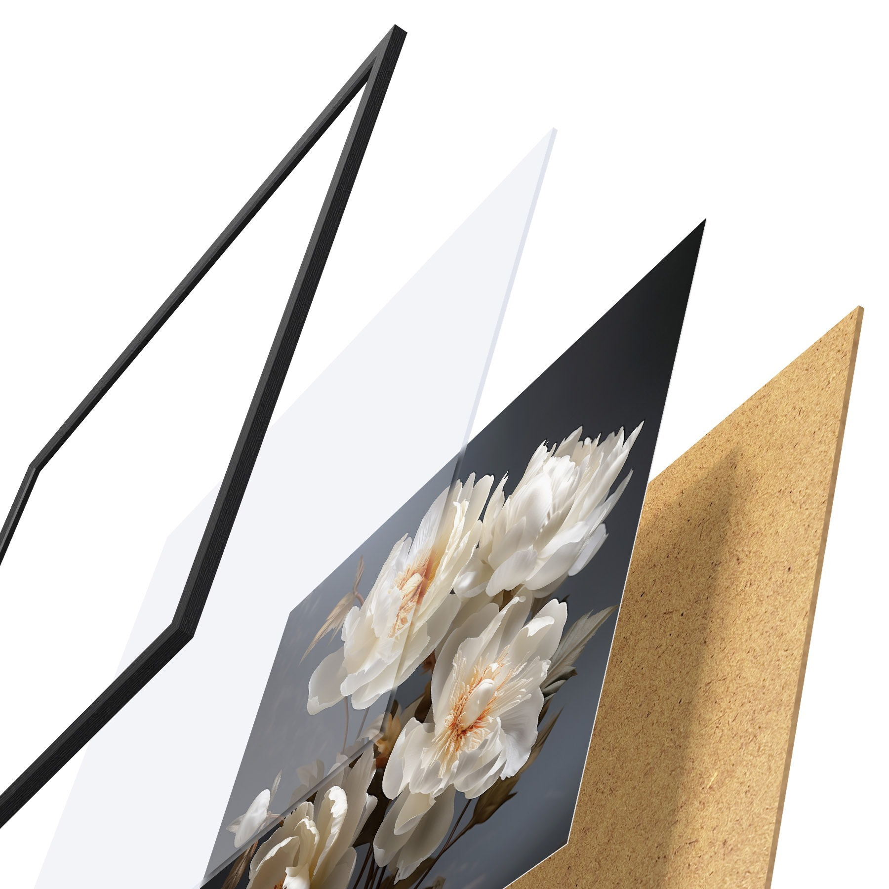 El póster consta de marco, plexiglás, imagen impresa y soporte de aglomerado. El póster puede colgarse inmediatamente en la pared gracias a los soportes de la parte posterior.
