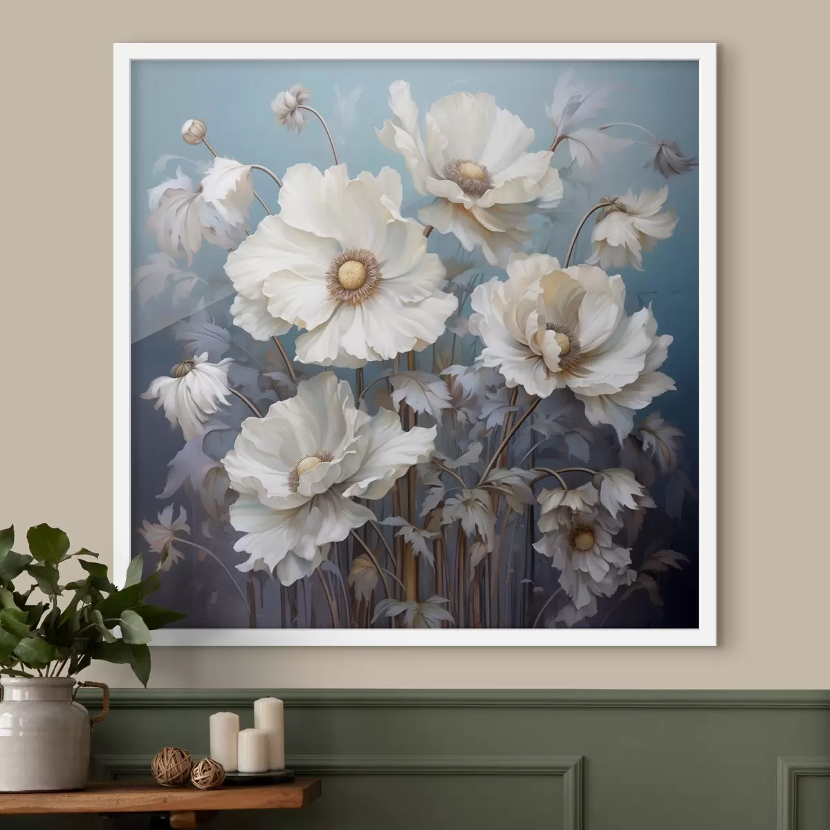 Poster Ramo de peonías blancas sobre fondo azul en estilo pictórico Nr f43370