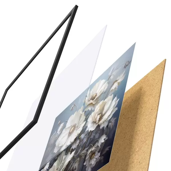 El póster consta de marco, plexiglás, imagen impresa y soporte de aglomerado. El póster puede colgarse inmediatamente en la pared gracias a los soportes de la parte posterior.