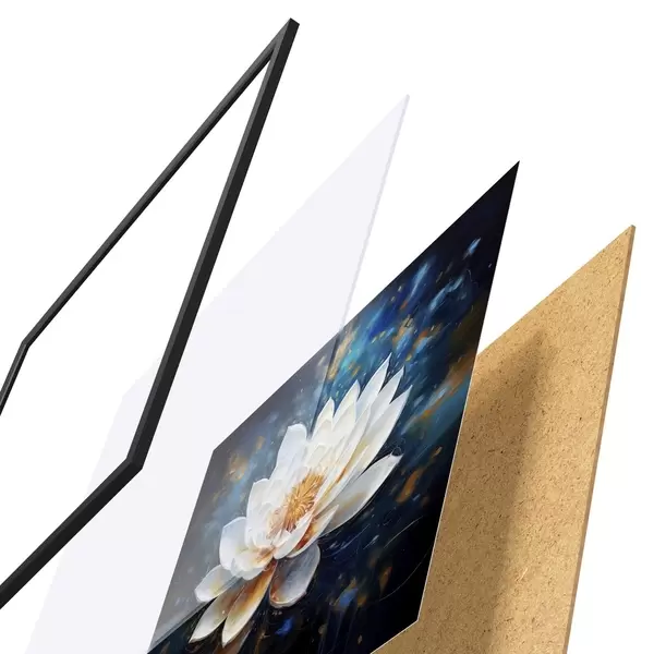 El póster consta de marco, plexiglás, imagen impresa y soporte de aglomerado. El póster puede colgarse inmediatamente en la pared gracias a los soportes de la parte posterior.