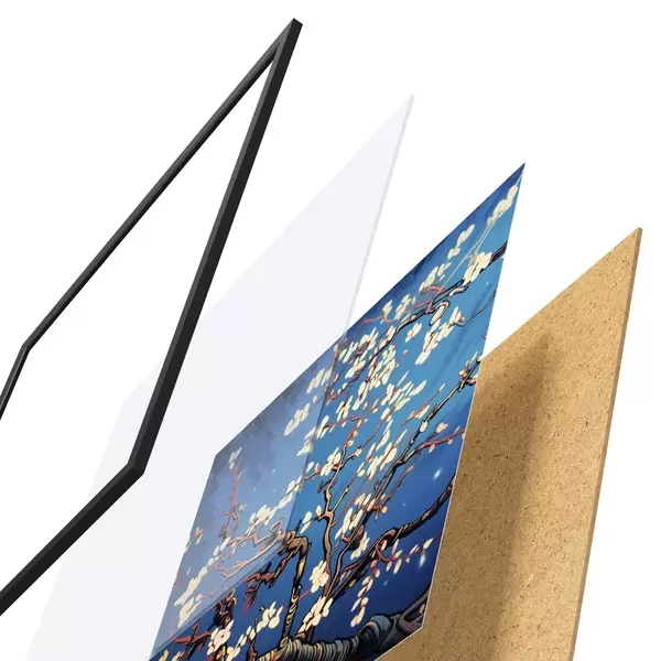 El póster consta de marco, plexiglás, imagen impresa y soporte de aglomerado. El póster puede colgarse inmediatamente en la pared gracias a los soportes de la parte posterior.
