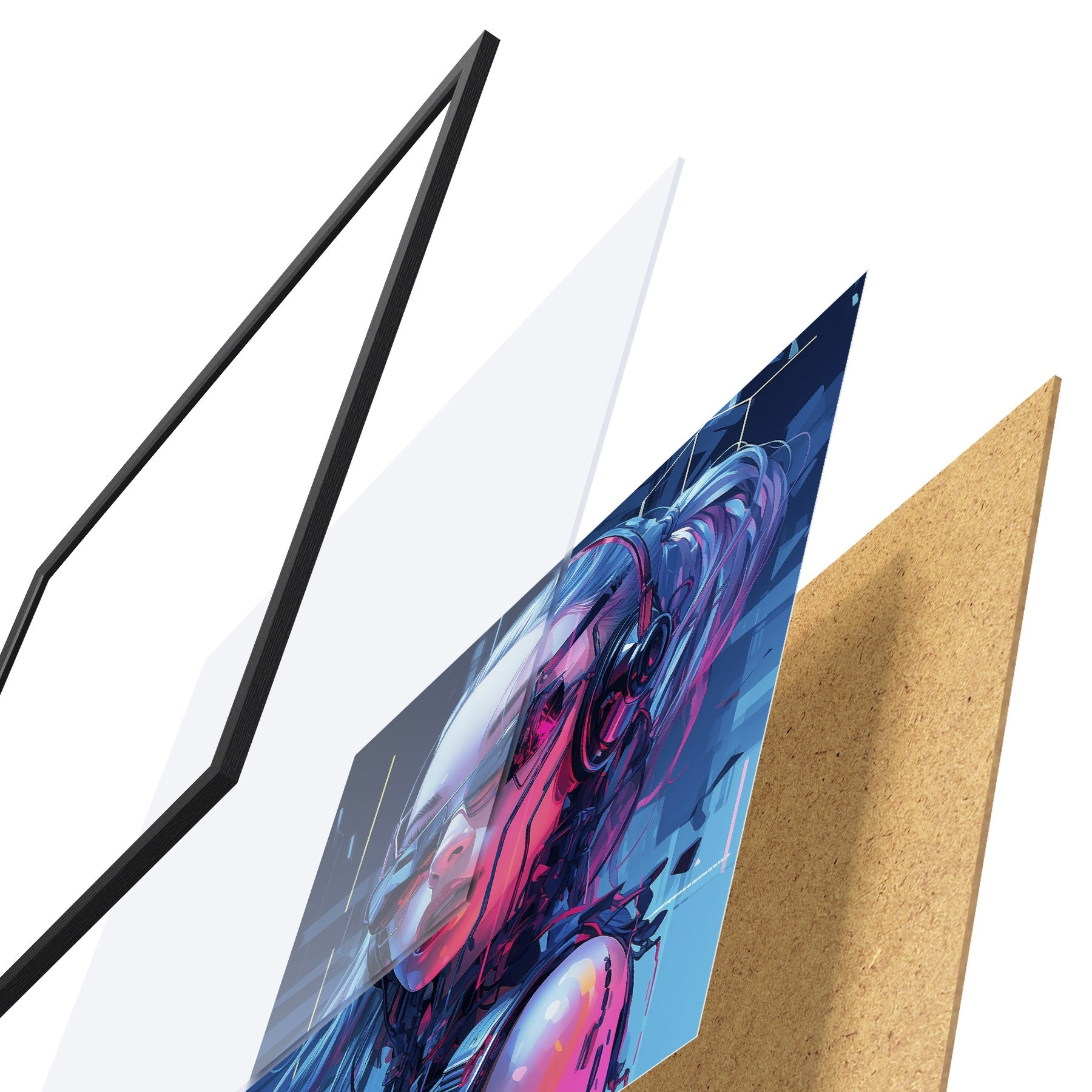 El póster consta de marco, plexiglás, imagen impresa y soporte de aglomerado. El póster puede colgarse inmediatamente en la pared gracias a los soportes de la parte posterior.