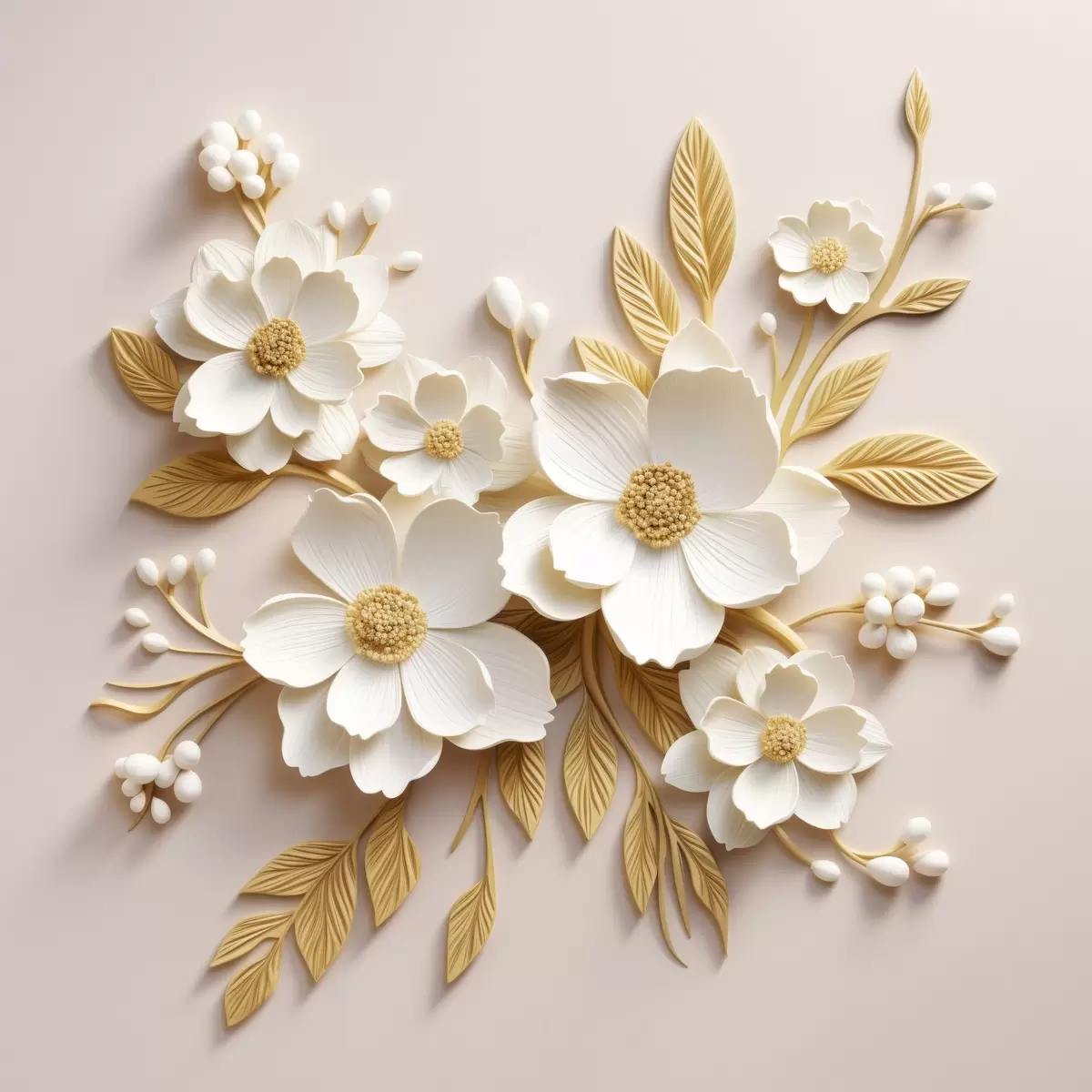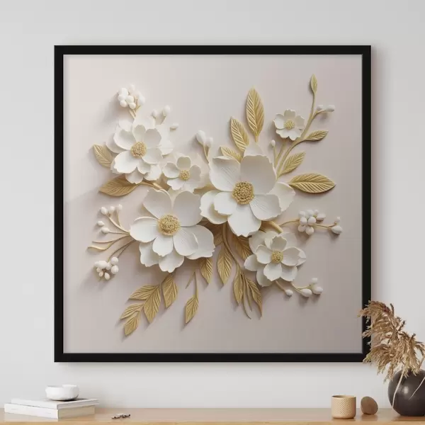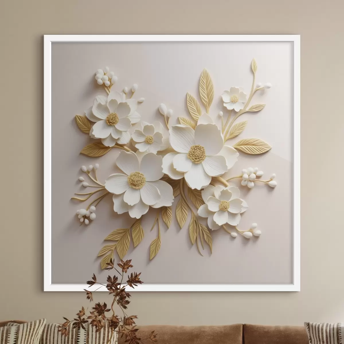 Poster flores blancas 3D con hojas sobre fondo crema f43383