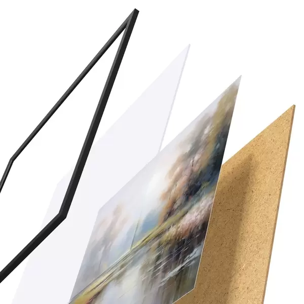 El póster consta de marco, plexiglás, imagen impresa y soporte de aglomerado. El póster puede colgarse inmediatamente en la pared gracias a los soportes de la parte posterior.