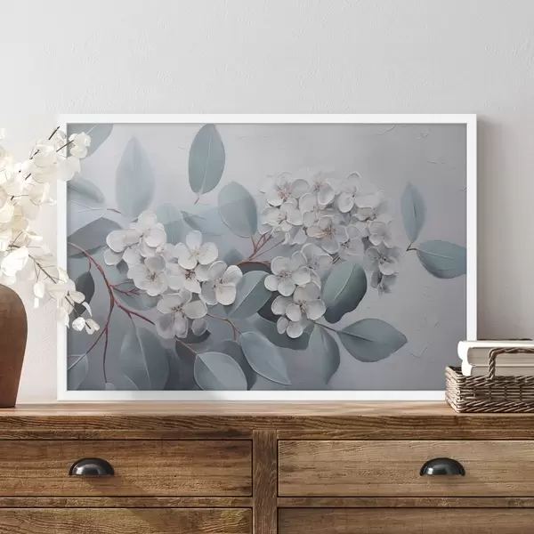 Poster Una rama de flores de hortensia blanca en plena floración, con hojas azules sobre un fondo gris claro, estilo pintura al óleo f43391