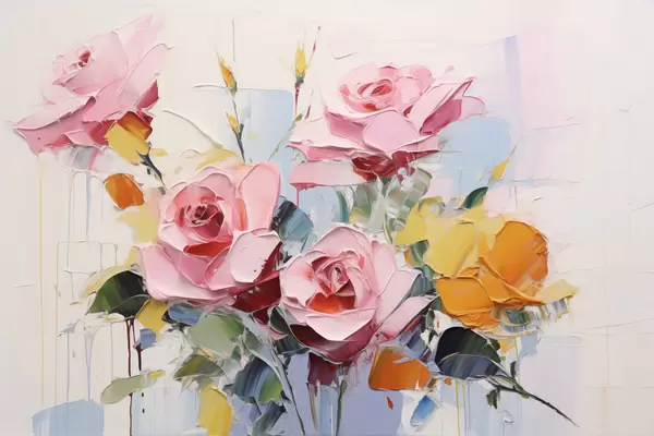 Poster Arte abstracto moderno de rosas rosas y amarillas con hojas, pinceladas gruesas, imitación de pintura al óleo, colores pastel Nr f43392