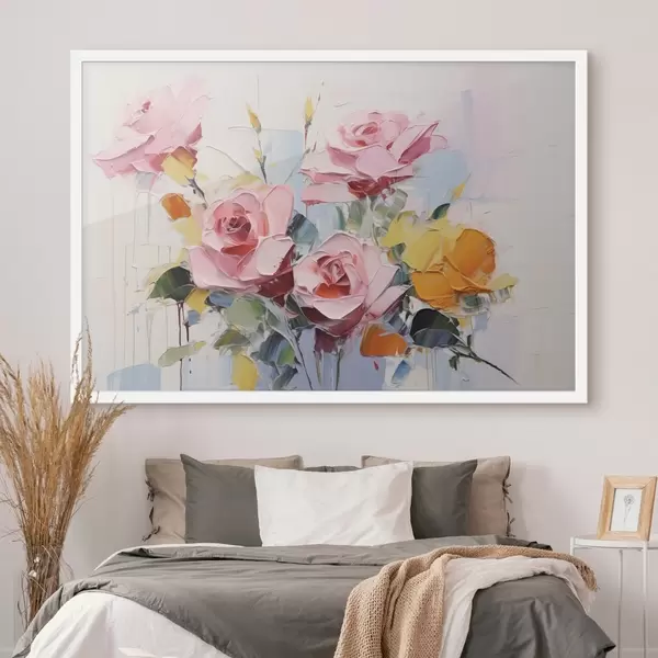 Poster Arte abstracto moderno de rosas rosas y amarillas con hojas, pinceladas gruesas, imitación de pintura al óleo, colores pastel f43392