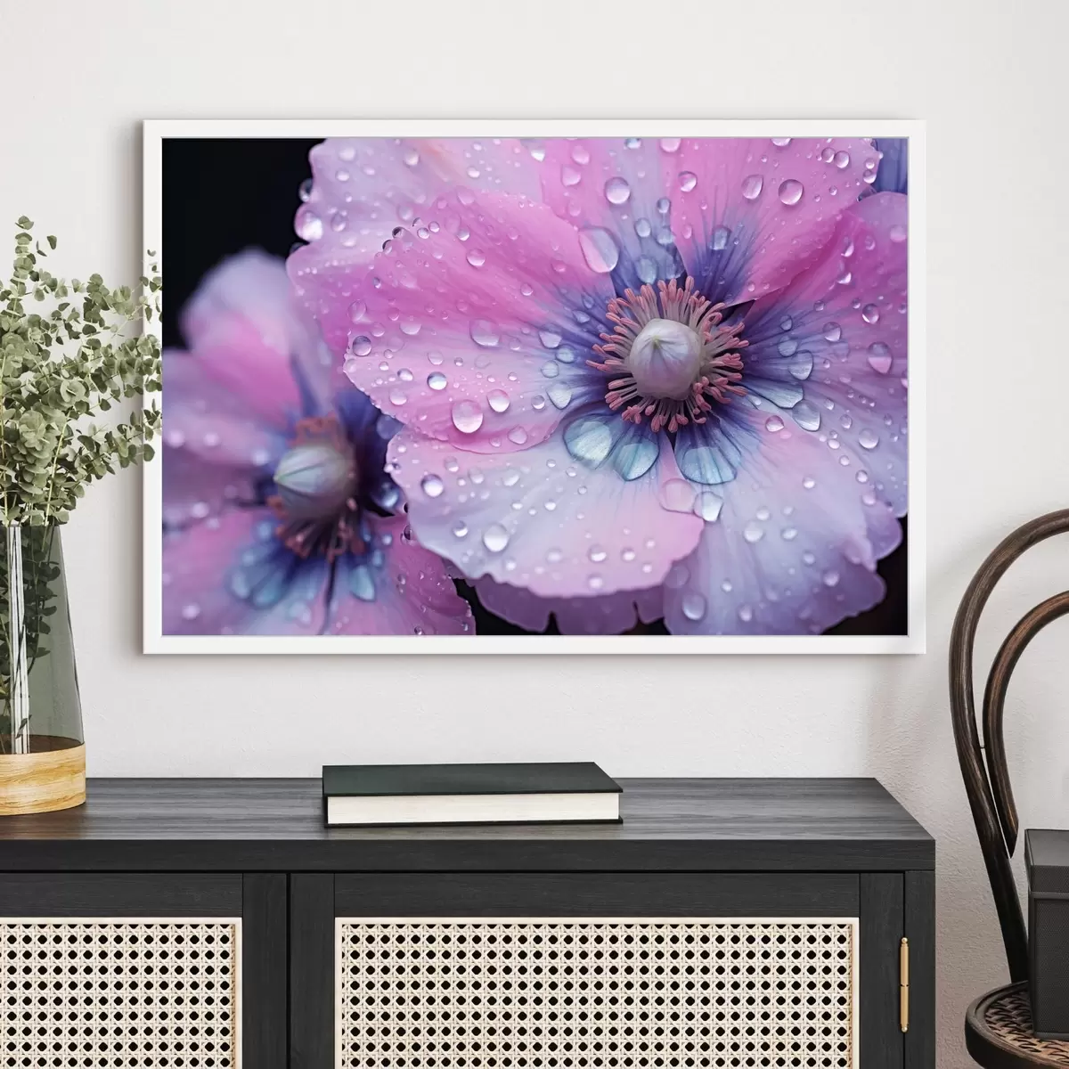 Poster Flores rosas y moradas en plena floración cubiertas de gotas de agua, sobre fondo oscuro f43394