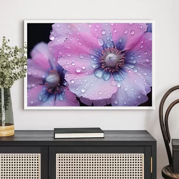 Poster Flores rosas y moradas en plena floración cubiertas de gotas de agua, sobre fondo oscuro Nr f43394