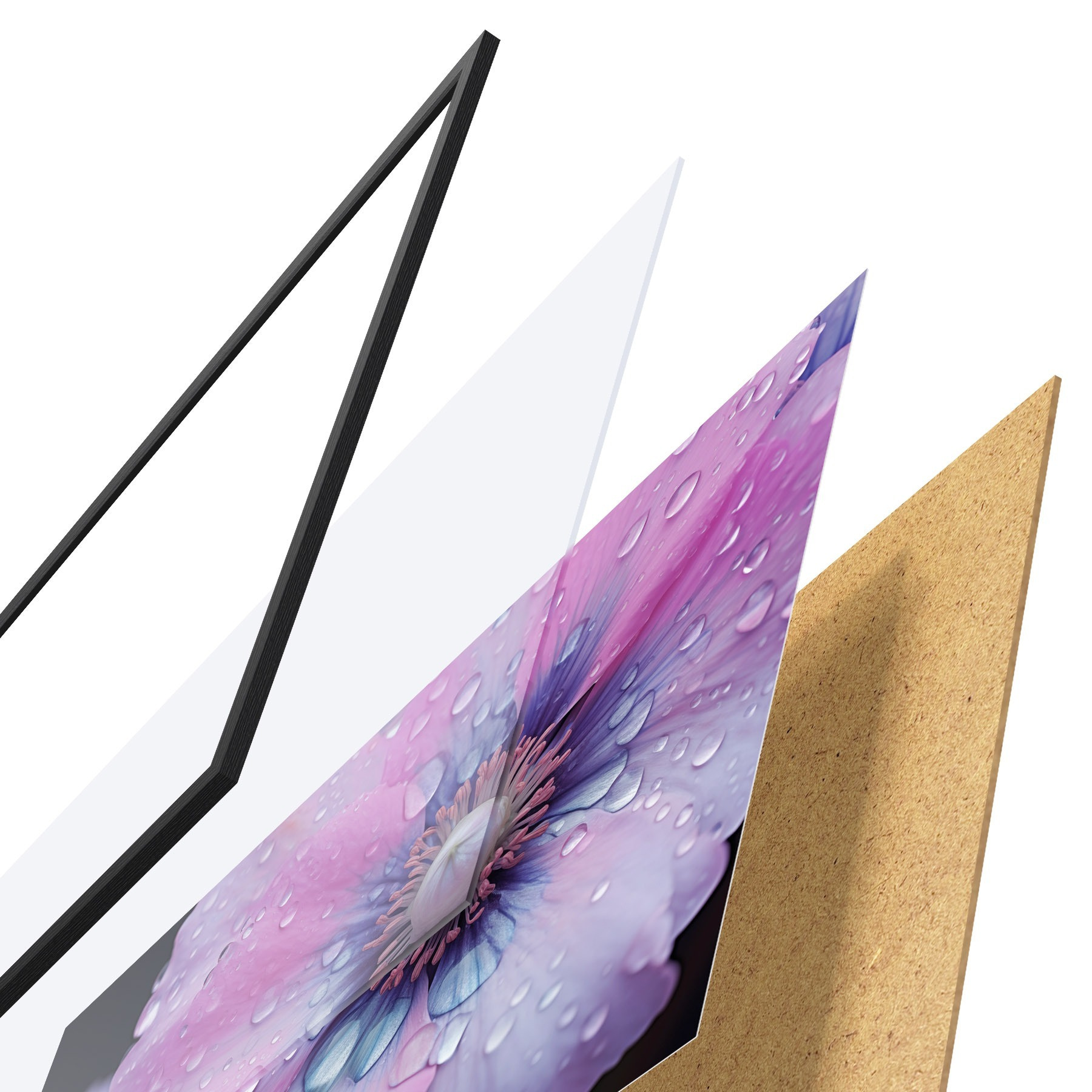 El póster consta de marco, plexiglás, imagen impresa y soporte de aglomerado. El póster puede colgarse inmediatamente en la pared gracias a los soportes de la parte posterior.