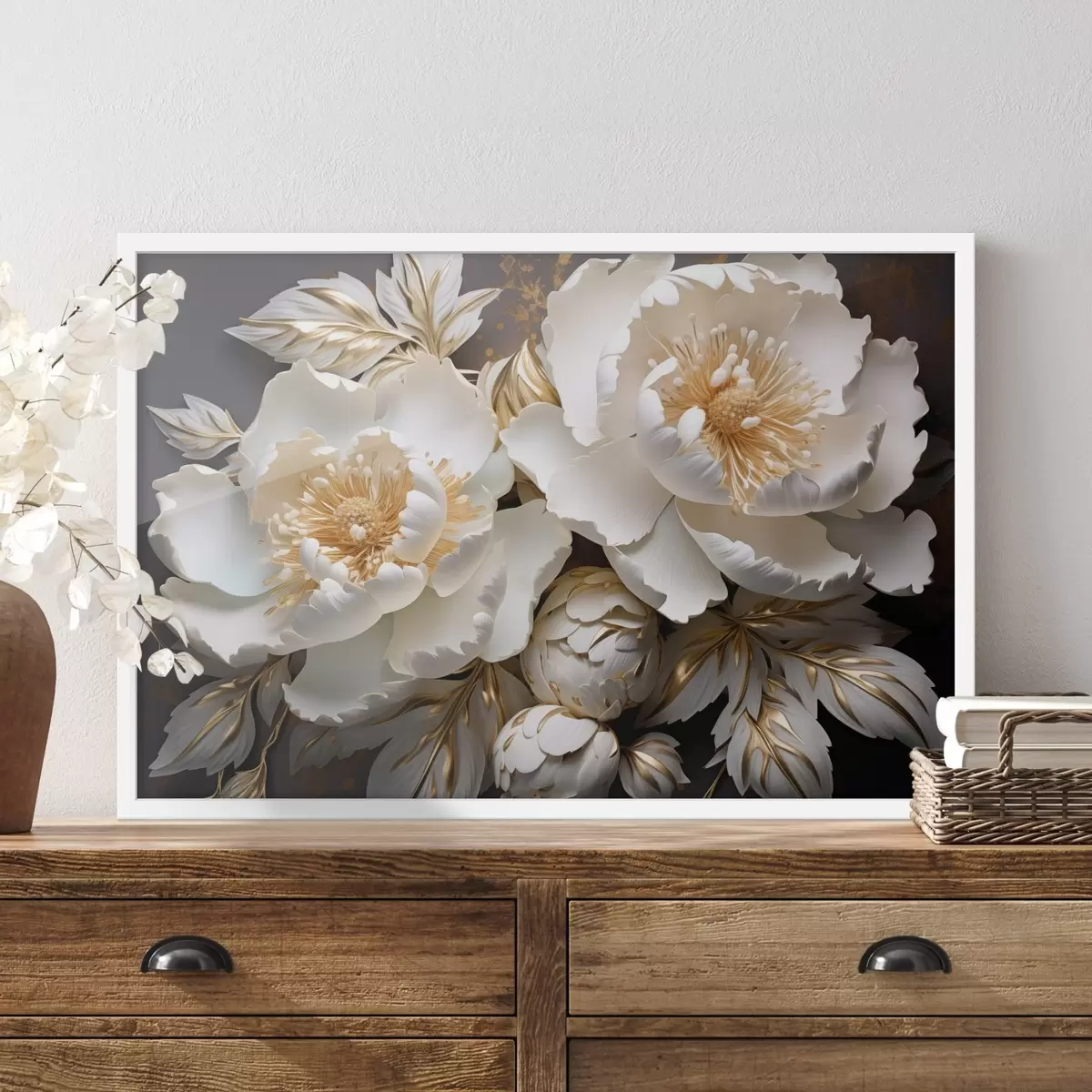 Poster Peonías blancas y amarillas con hojas, detalles intrincados, arte decorativo, fondo oscuro Nr f43399