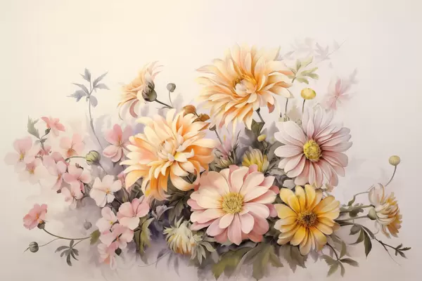 Poster Colección de flores rosas, amarillas y naranjas, fondo claro, colores suaves, estilo vintage, ilustración botánica Nr f43401