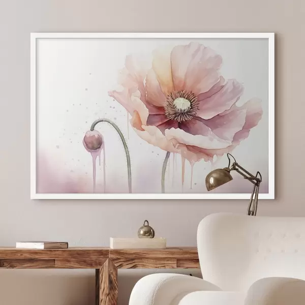 Poster Una flor de amapola de color rosa con un capullo sobre un fondo blanco, acuarela pintura de imitación con goteos, colores suaves Nr f43402