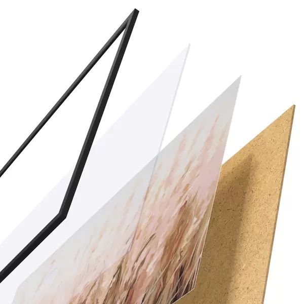 El póster consta de marco, plexiglás, imagen impresa y soporte de aglomerado. El póster puede colgarse inmediatamente en la pared gracias a los soportes de la parte posterior.
