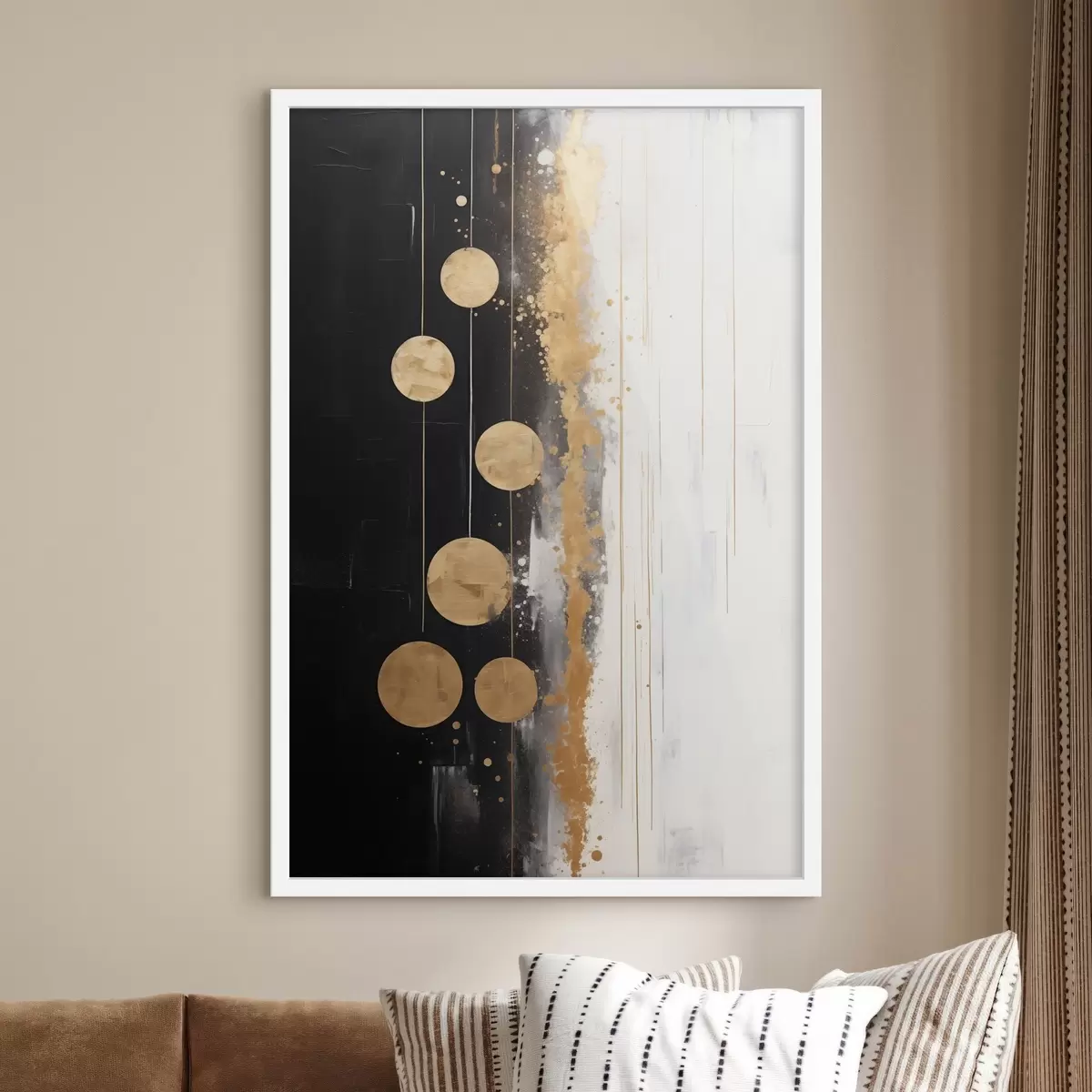Poster Arte abstracto con círculos amarillos colgando sobre fondo blanco y negro con manchas blancas y amarillas Nr f43410