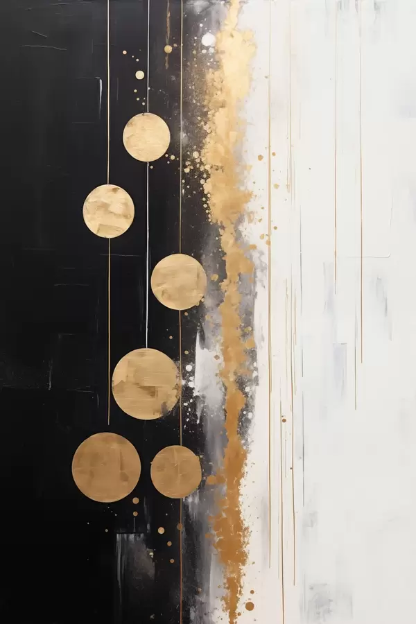 Poster Arte abstracto con círculos amarillos colgando sobre fondo blanco y negro con manchas blancas y amarillas Nr f43410