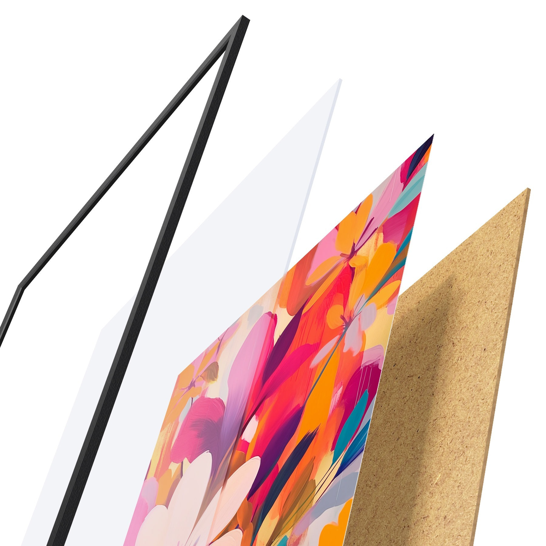 El póster consta de marco, plexiglás, imagen impresa y soporte de aglomerado. El póster puede colgarse inmediatamente en la pared gracias a los soportes de la parte posterior.