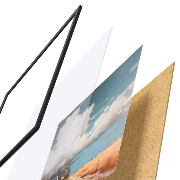 El póster consta de marco, plexiglás, imagen impresa y soporte de aglomerado. El póster puede colgarse inmediatamente en la pared gracias a los soportes de la parte posterior.