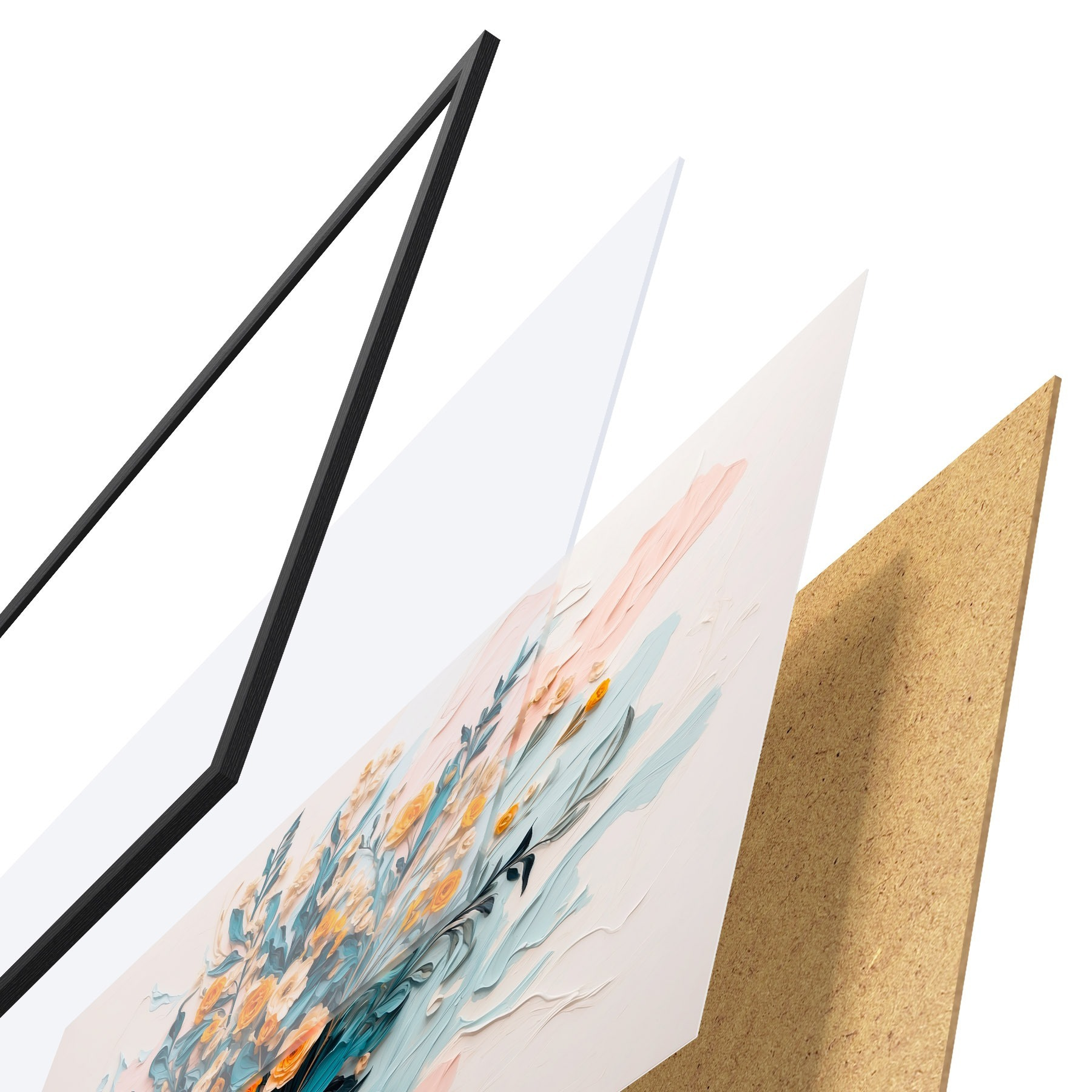 El póster consta de marco, plexiglás, imagen impresa y soporte de aglomerado. El póster puede colgarse inmediatamente en la pared gracias a los soportes de la parte posterior.