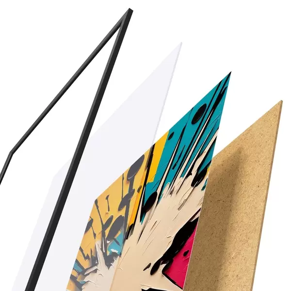 El póster consta de marco, plexiglás, imagen impresa y soporte de aglomerado. El póster puede colgarse inmediatamente en la pared gracias a los soportes de la parte posterior.
