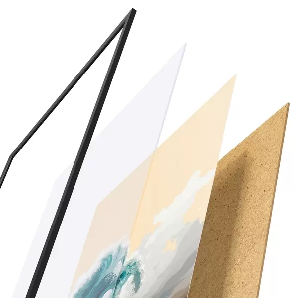 El póster consta de marco, plexiglás, imagen impresa y soporte de aglomerado. El póster puede colgarse inmediatamente en la pared gracias a los soportes de la parte posterior.