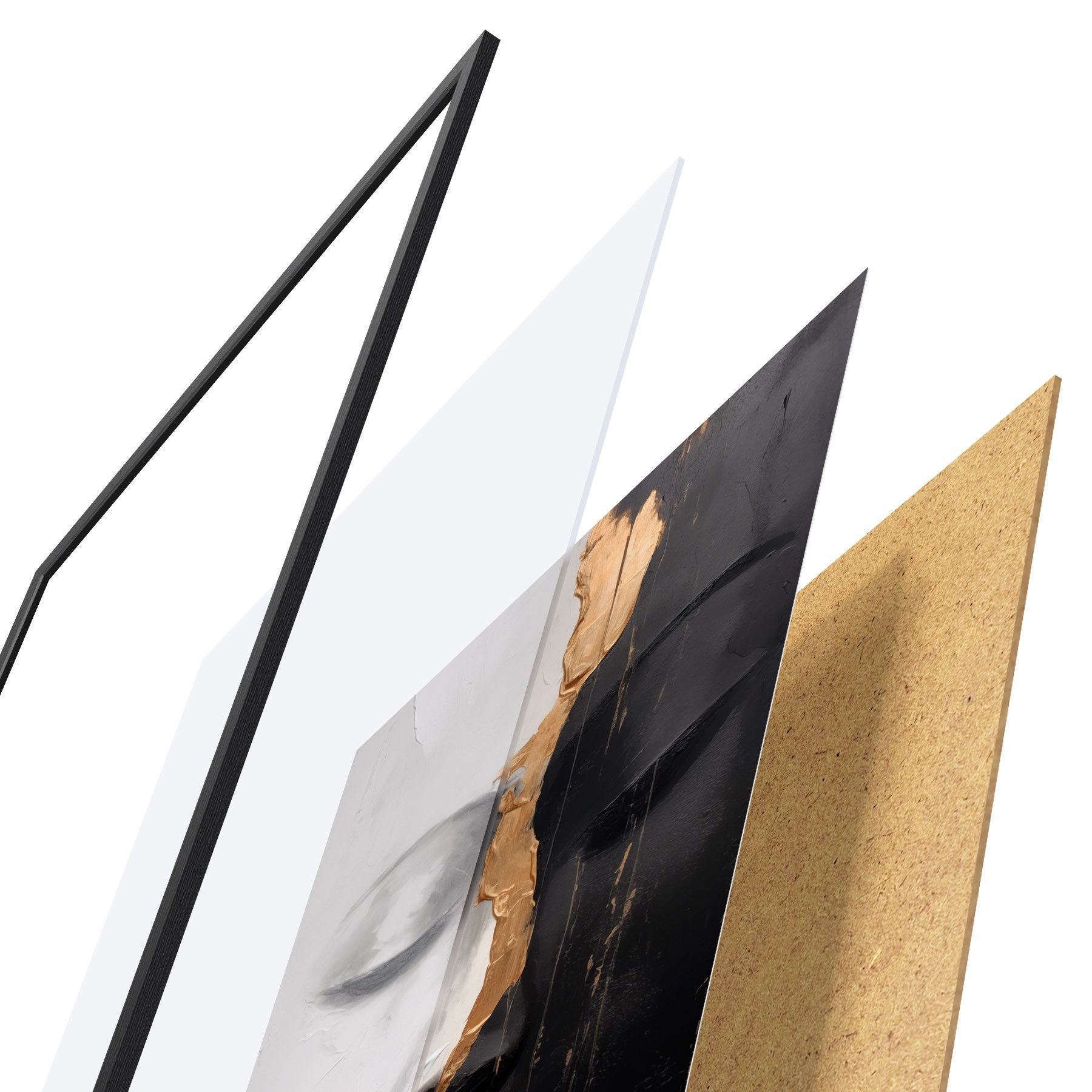 El póster consta de marco, plexiglás, imagen impresa y soporte de aglomerado. El póster puede colgarse inmediatamente en la pared gracias a los soportes de la parte posterior.