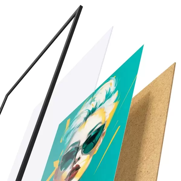 El póster consta de marco, plexiglás, imagen impresa y soporte de aglomerado. El póster puede colgarse inmediatamente en la pared gracias a los soportes de la parte posterior.