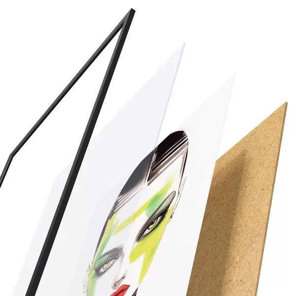 El póster consta de marco, plexiglás, imagen impresa y soporte de aglomerado. El póster puede colgarse inmediatamente en la pared gracias a los soportes de la parte posterior.