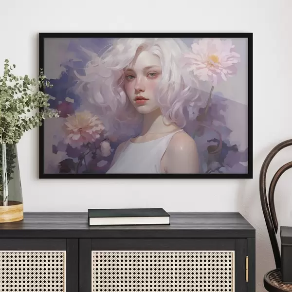 Poster Hermosa chica en las flores, dibujo estilo acrílico, Japón, colores púrpura Nr f43495