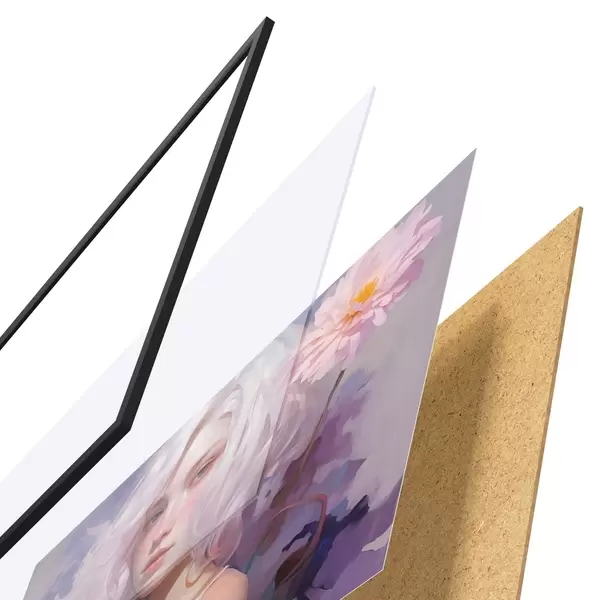 El póster consta de marco, plexiglás, imagen impresa y soporte de aglomerado. El póster puede colgarse inmediatamente en la pared gracias a los soportes de la parte posterior.