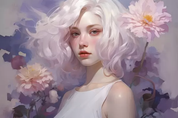 Poster Hermosa chica en las flores, dibujo estilo acrílico, Japón, colores púrpura Nr f43495